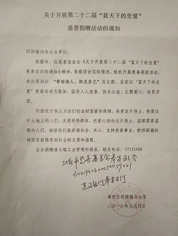 眾幸股份的下屬公司上海尊島防護(hù)科技有限公司響應(yīng)四團(tuán)鎮(zhèn)人民政府的號(hào)召,積極參與公益事業(yè),為第二十二屆“藍(lán)天下的至愛(ài)”慈善活動(dòng)添磚加瓦,貢獻(xiàn)自己的綿薄之力。